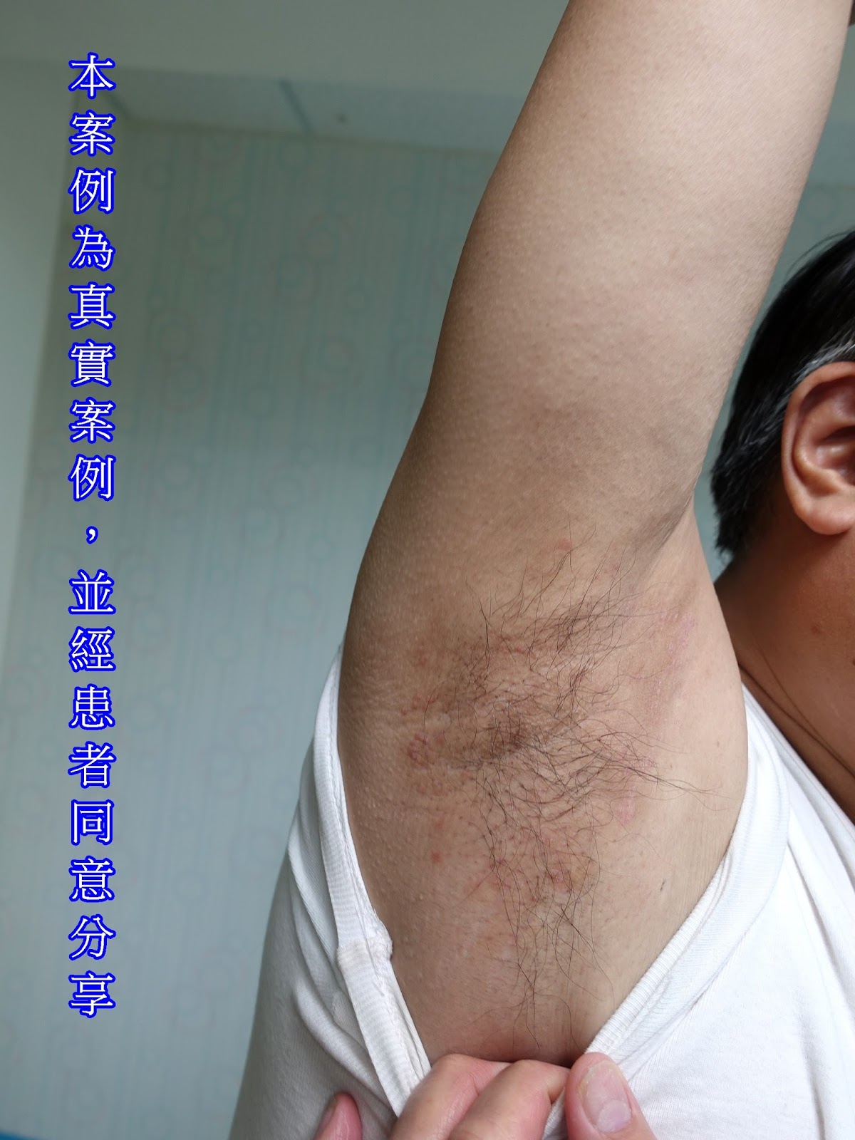 許先生,乾癬20多年,來治療時全身是乾癬,治療一陣子後,身上病兆都有改善,就腋下,胯下,不太會好,(因為尺度問題,我們po腋下照就好了...)有時還會惡化,許先生對這幾塊也很煩,阿統醫師每次看到這幾個部位,也很擔心,(靠!不會招牌就被你這幾個部位給毀了吧...)